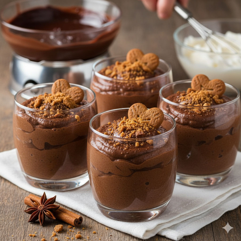 - Kühlen & Servieren: Mousse in Gläser füllen, mind. 2 Stunden kaltstellen. Mit Kakaopulver und Lebkuchenbröseln garnieren.