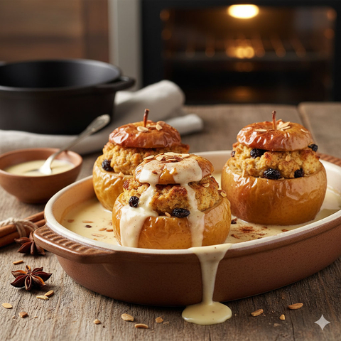- Backen: Äpfel in eine Auflaufform setzen, Apfelsaft angießen und 25–30 Minuten im Ofen garen, bis sie weich sind.