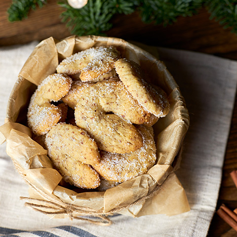 - Formen: Backofen auf 180 °C Ober-/Unterhitze vorheizen. Aus dem Teig Rollen formen, in ca. 5 cm Stücke schneiden und zu Kipferln biegen.